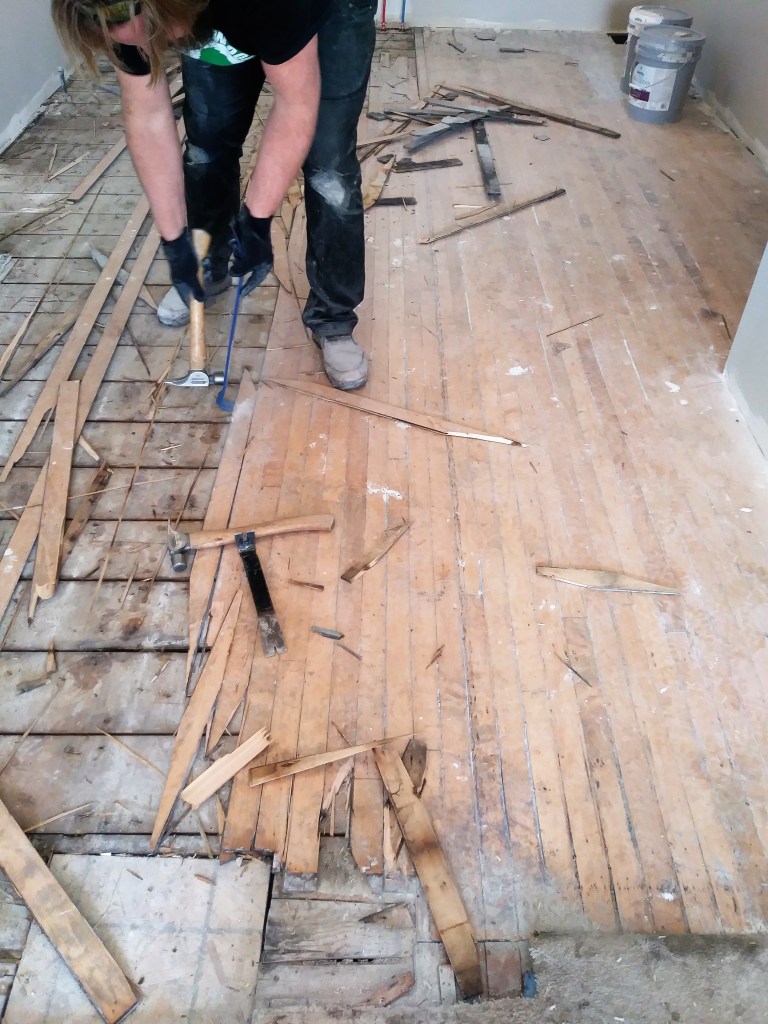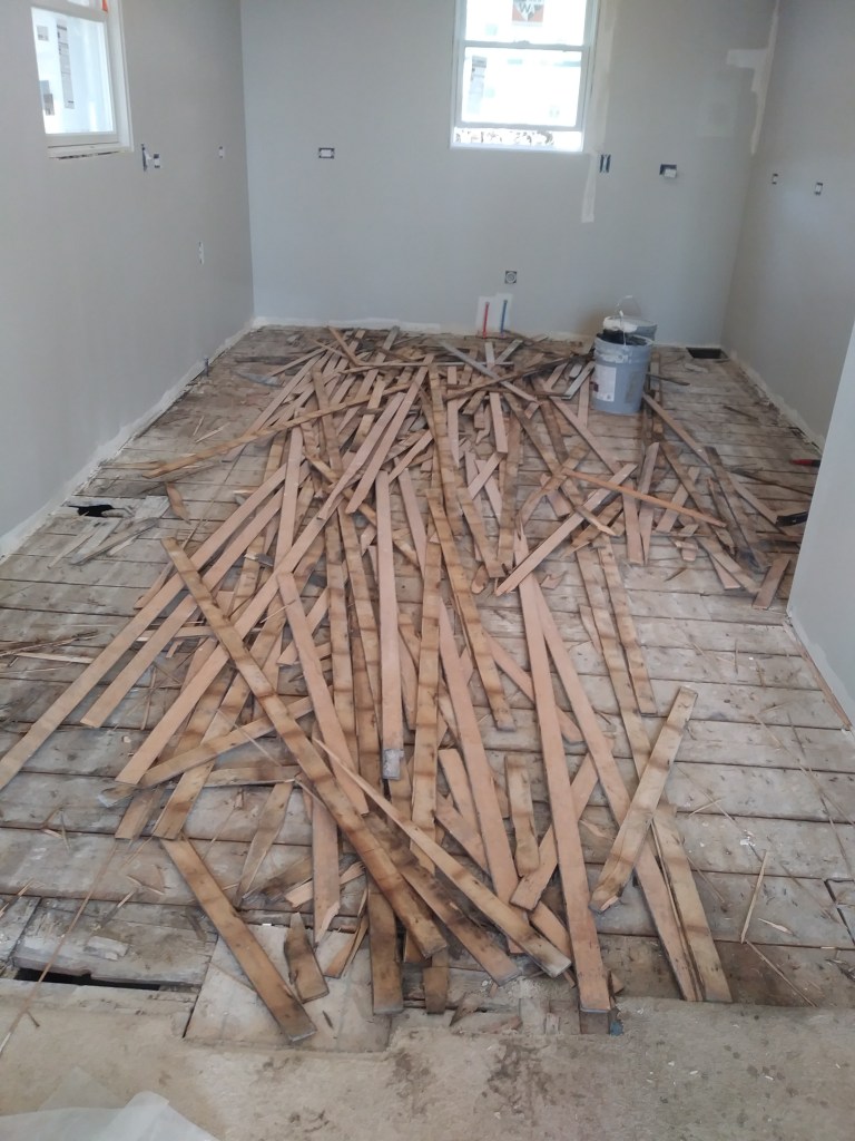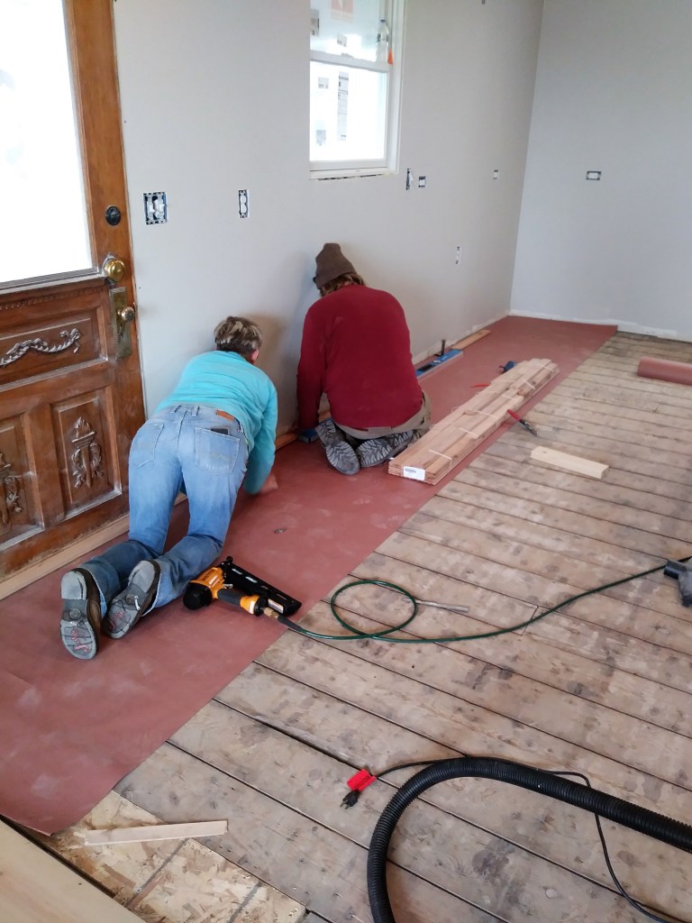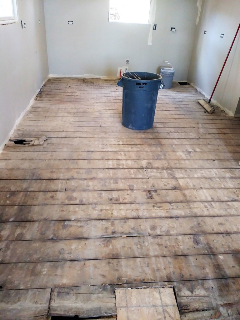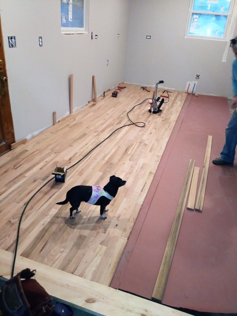 Moving right alongggg.. We opted for Sherwin Williams Agreeable Gray. I love this color! Its such a lovely soft gray and goes with just about anything. I didn’t want to pay S.W pricing so I took the paint swatch over to Menards and had them color match it to Dutch Boy paint. The floor was pretty rough from the previous leaky sink and still had layers of tile around the room under where the cabinets used to be. We got a great deal on unfinished Rustic Oak so up came the floor. We wanted to keep it as conducive as possible to the existing original floors throughout the house. My helpful MIL came over to help pull allll the nails from the floor and we all began laying the new floor yesterday. The New Cabinets come on Friday so we’ll be spending the weekend installing those!
