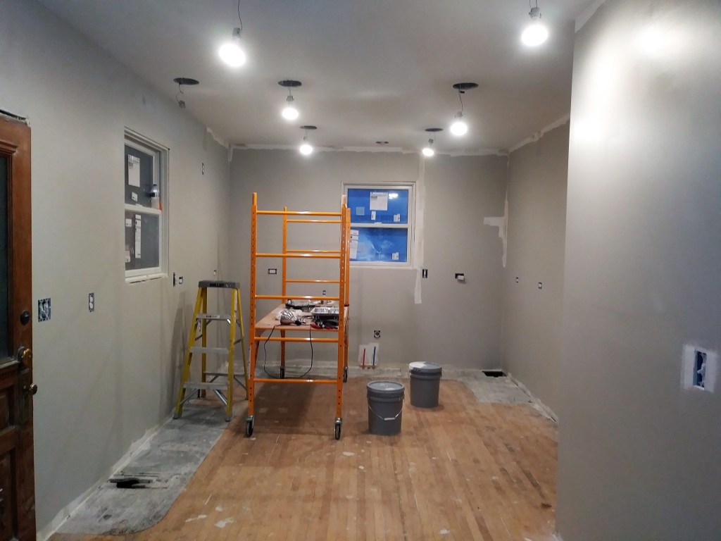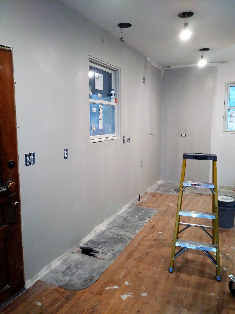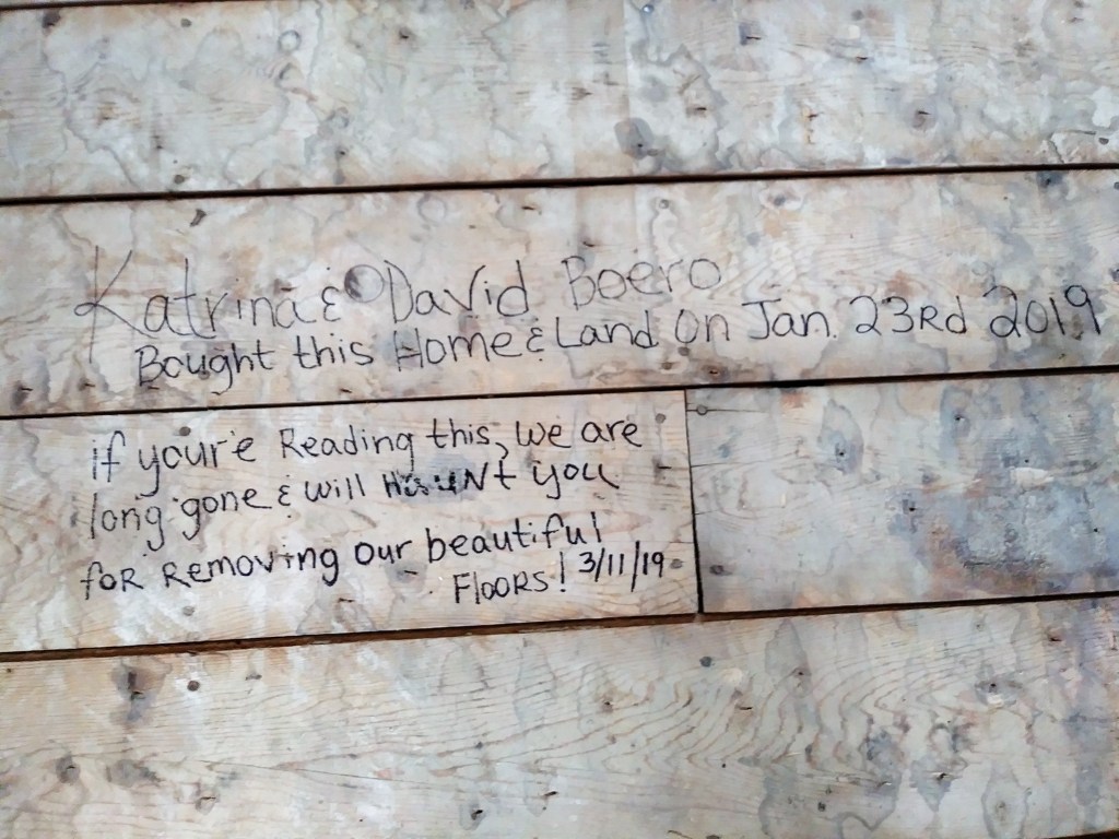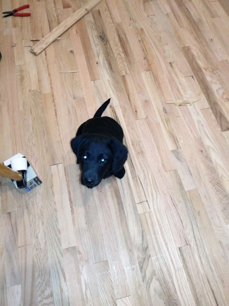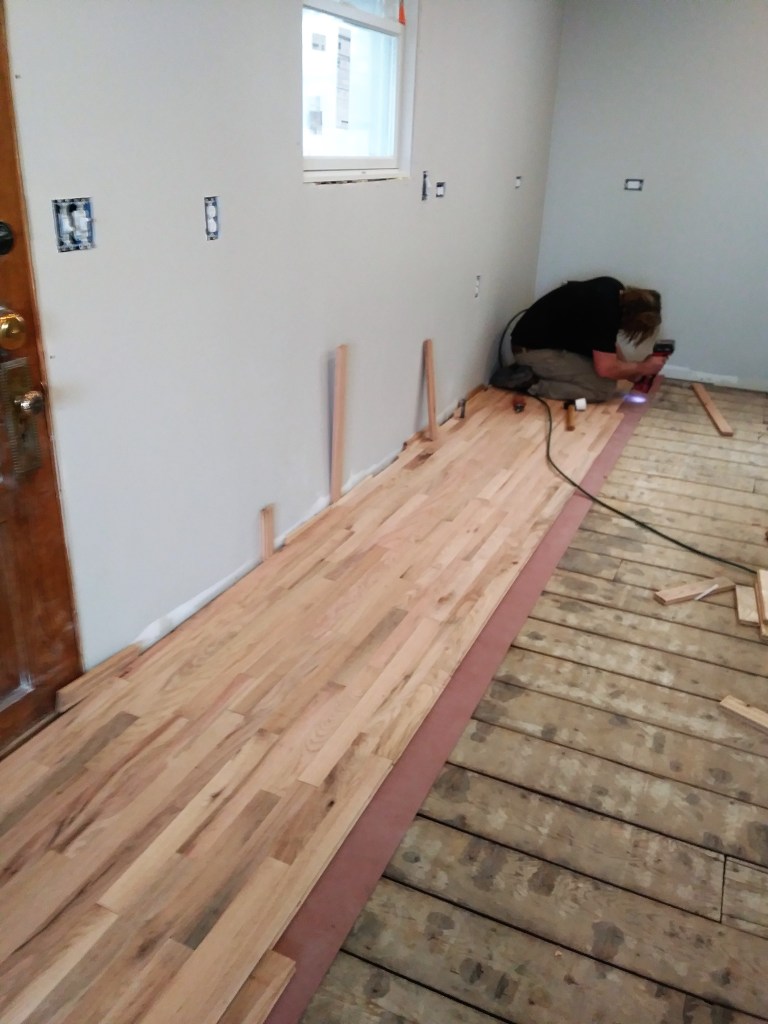 Moving right alongggg.. We opted for Sherwin Williams Agreeable Gray. I love this color! Its such a lovely soft gray and goes with just about anything. I didn’t want to pay S.W pricing so I took the paint swatch over to Menards and had them color match it to Dutch Boy paint. The floor was pretty rough from the previous leaky sink and still had layers of tile around the room under where the cabinets used to be. We got a great deal on unfinished Rustic Oak so up came the floor. We wanted to keep it as conducive as possible to the existing original floors throughout the house. My helpful MIL came over to help pull allll the nails from the floor and we all began laying the new floor yesterday. The New Cabinets come on Friday so we’ll be spending the weekend installing those!