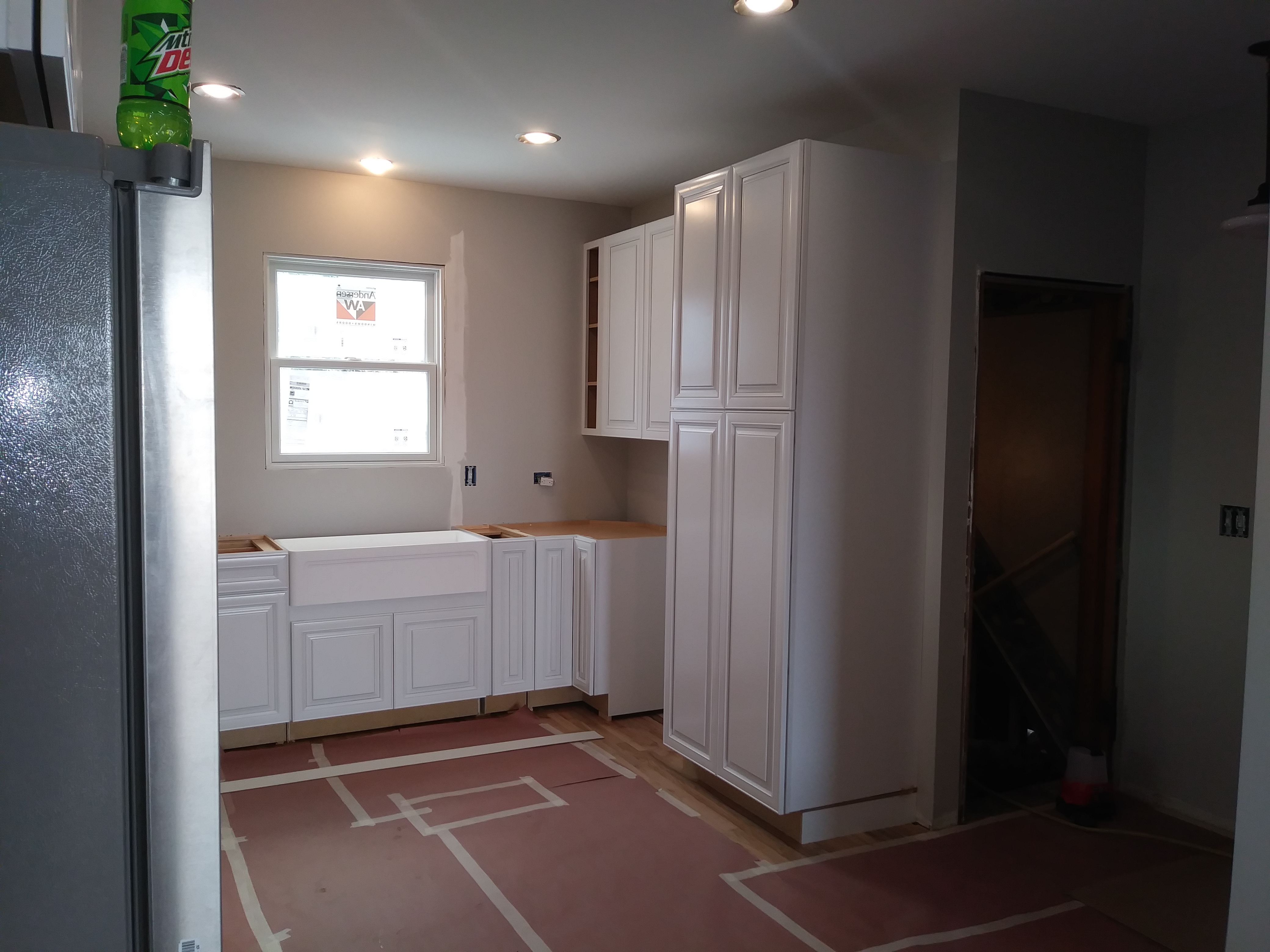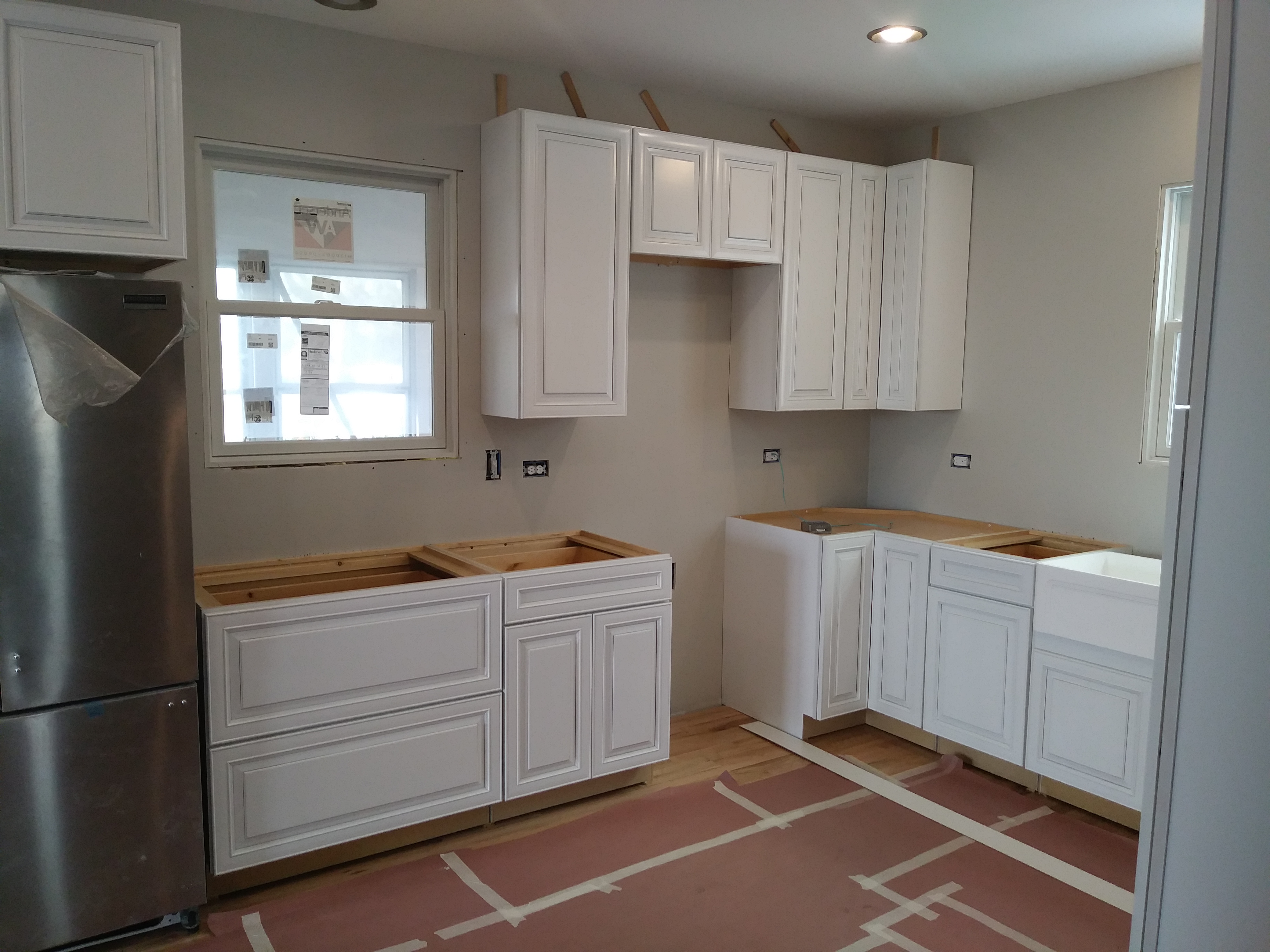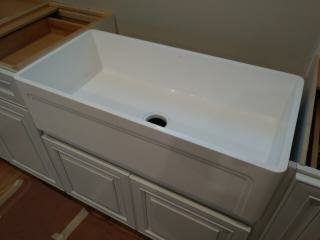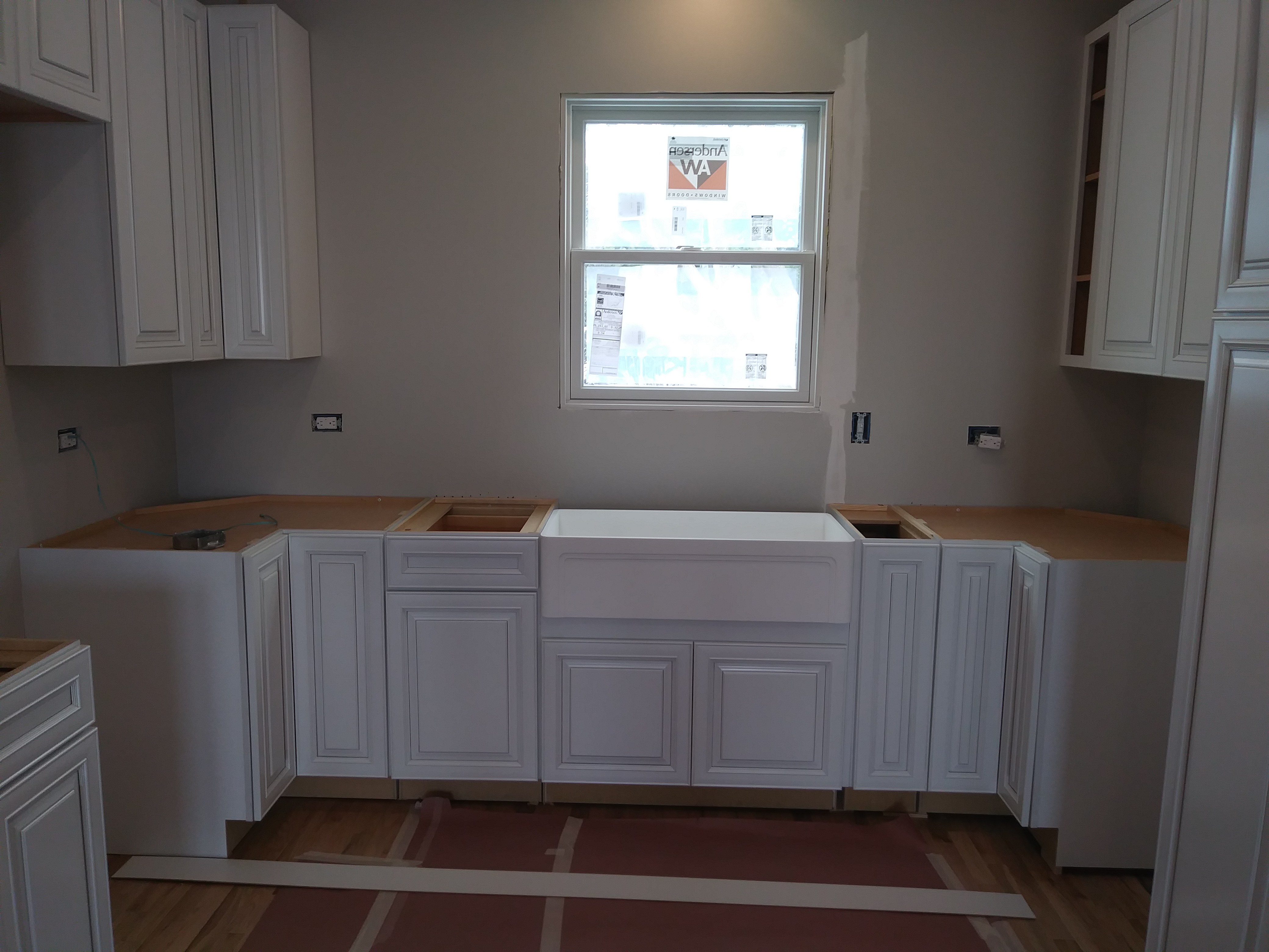 Its been a few weeks and our Kitchen is ALMOST complete! The Counter Tops will be installed next week! We have been rushing to get things done since my Husband has to return back to work soon (He’s a seasonal Carpenter) and let me tell you, its been crazy! After putting down the new floor, We were on to the Cabinets! Its a pretty horrible experience trying to install cabinets on old framed walls and uneven floors. My husband and I installed them by ourselves and let me just say, ” If you ever want to see if your marriage can withstand the test of time, Remodeling an old house with your spouse is the test!’ Lol! Luckily we love each other (Again anyway) ; ) Now the cabinets are up, (We’ll be installing open shelving on the sink wall) the floors are papered for protection and I can see how amazing my new Farm sink will look! Farm sinks can range anywhere between $500.00 up to the thousands! I had been searching ALLL… the buy and sell web sites for months because I wasn’t about to pay full price, HEY I’m (cheap) frugal! For the life of me I couldn’t find a deal anywhere until one magical evening we took a trip to Lowe’s for some clearance floor tile (More on that in the next post). I just happened to be minding my own business when I stumbled across a different clearance isle. Of course I made a bee line for it! Just your typical home improvement what not’s and then I approached the end of the isle. A sparkling, shimmery light shone down from above upon a large box. Upon closer review the picture showed a beautiful Farm sink. That’s right..The type of sink I had been searching for. The tag showed $800.00+ that was reduced down to just $200.00 due to a Customer return. Could it be!? Was it an error!? My breath caught in my chest and I excitedly called my Husband over to load it in the cart. He laughed at me as I half ran to the register guarding my newly found treasure like a prisoner protecting his food at chow time. The Cashier pulled out her wand. I held my breath and heard the dreaded BEEP. She exclaimed that it wasn’t ringing up and called the manager over.