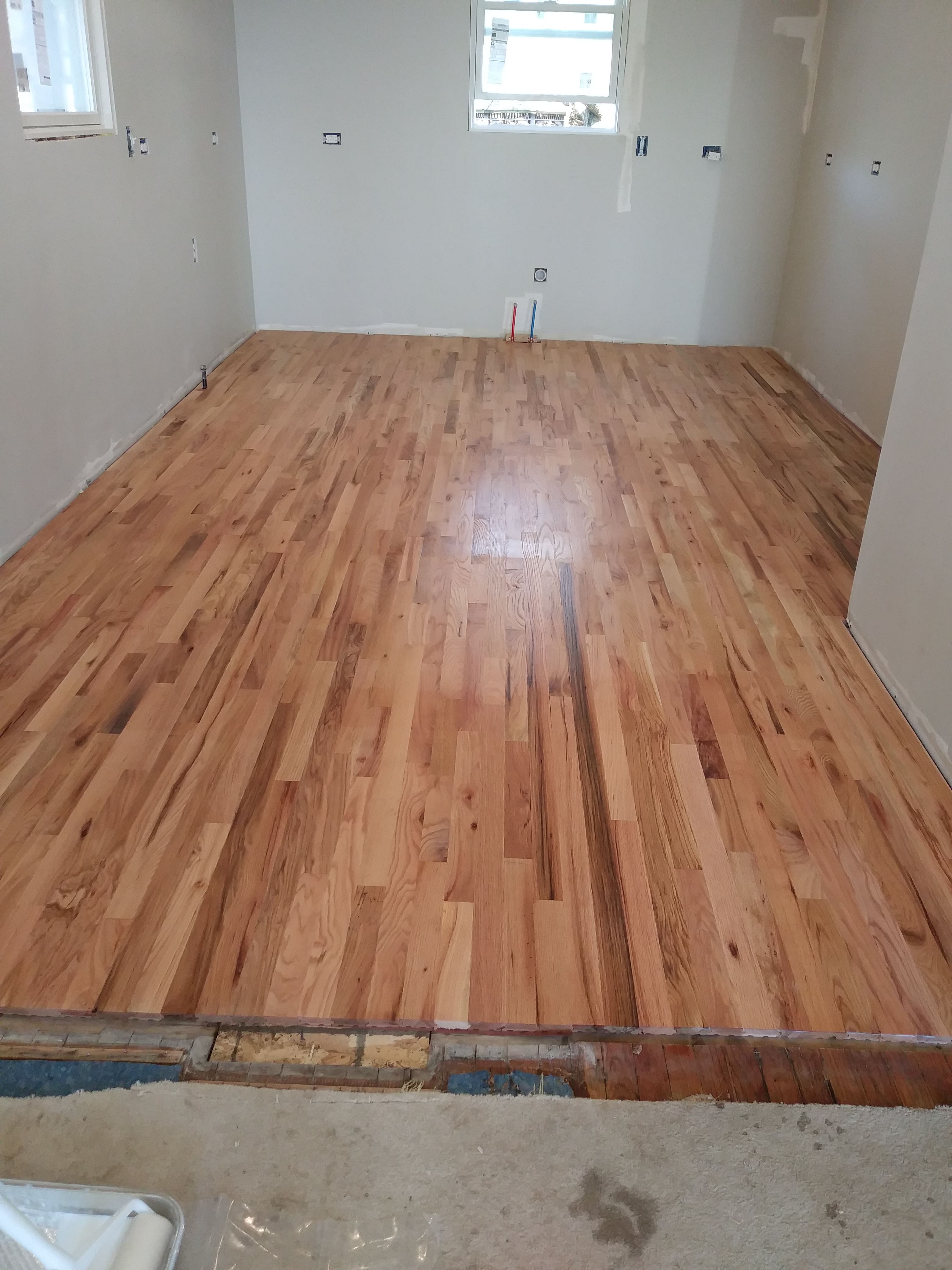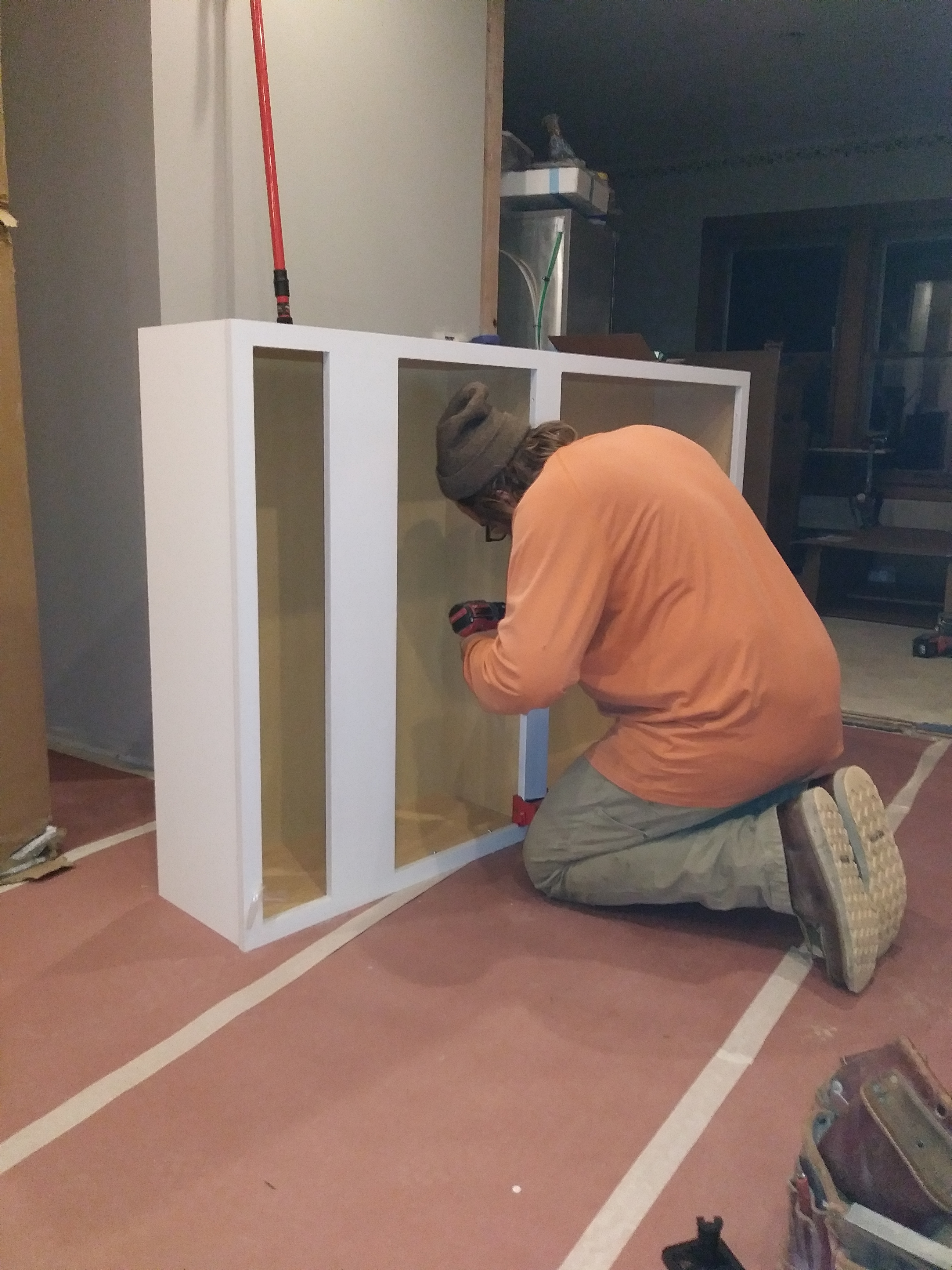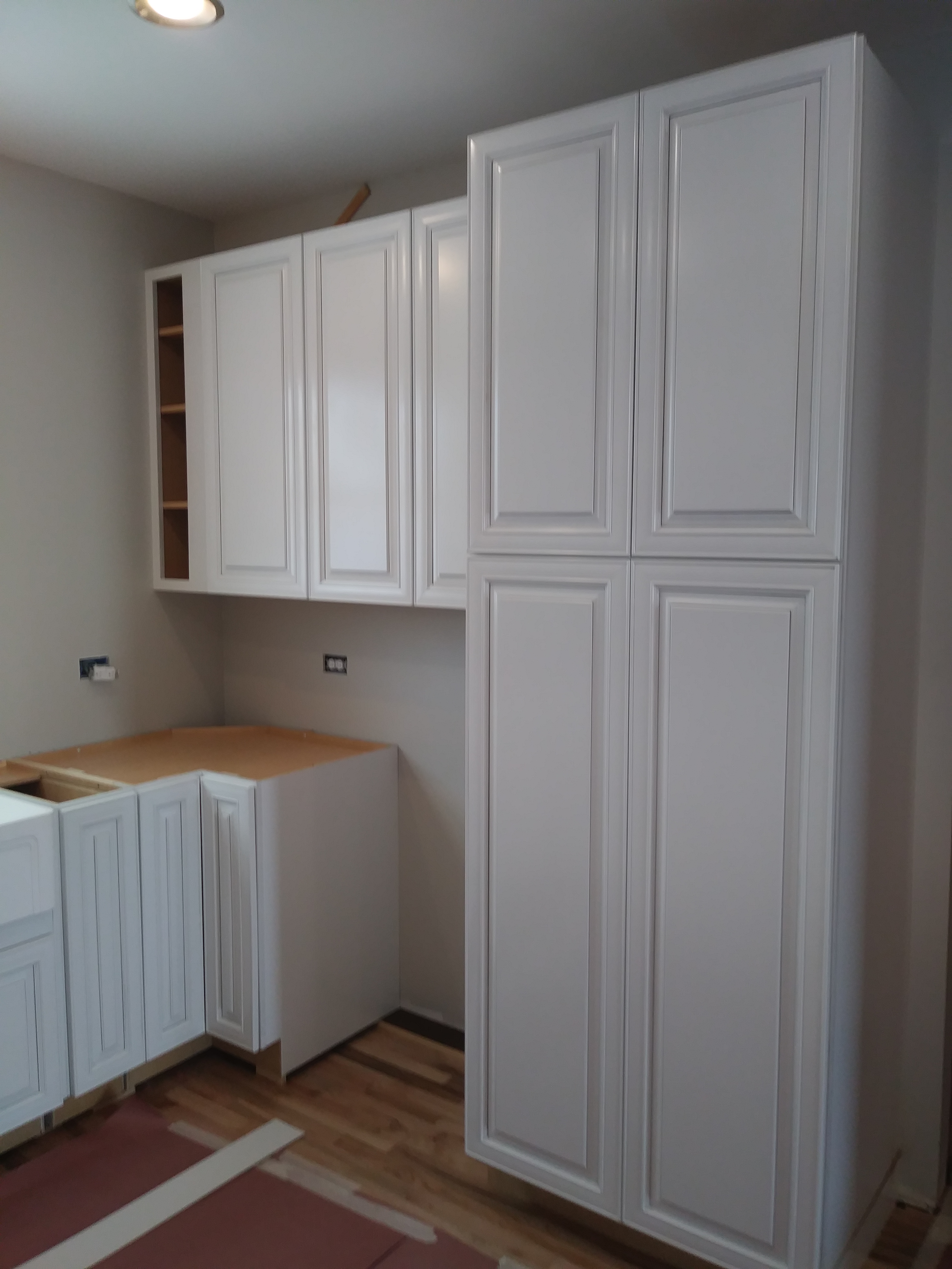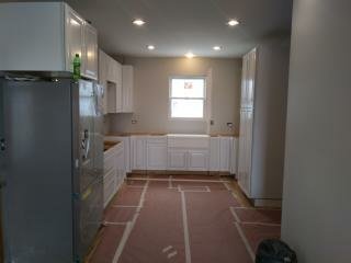 Its been a few weeks and our Kitchen is ALMOST complete! The Counter Tops will be installed next week! We have been rushing to get things done since my Husband has to return back to work soon (He’s a seasonal Carpenter) and let me tell you, its been crazy! After putting down the new floor, We were on to the Cabinets! Its a pretty horrible experience trying to install cabinets on old framed walls and uneven floors. My husband and I installed them by ourselves and let me just say, ” If you ever want to see if your marriage can withstand the test of time, Remodeling an old house with your spouse is the test!’ Lol! Luckily we love each other (Again anyway) ; ) Now the cabinets are up, (We’ll be installing open shelving on the sink wall) the floors are papered for protection and I can see how amazing my new Farm sink will look! Farm sinks can range anywhere between $500.00 up to the thousands! I had been searching ALLL… the buy and sell web sites for months because I wasn’t about to pay full price, HEY I’m (cheap) frugal! For the life of me I couldn’t find a deal anywhere until one magical evening we took a trip to Lowe’s for some clearance floor tile (More on that in the next post). I just happened to be minding my own business when I stumbled across a different clearance isle. Of course I made a bee line for it! Just your typical home improvement what not’s and then I approached the end of the isle. A sparkling, shimmery light shone down from above upon a large box. Upon closer review the picture showed a beautiful Farm sink. That’s right..The type of sink I had been searching for. The tag showed $800.00+ that was reduced down to just $200.00 due to a Customer return. Could it be!? Was it an error!? My breath caught in my chest and I excitedly called my Husband over to load it in the cart. He laughed at me as I half ran to the register guarding my newly found treasure like a prisoner protecting his food at chow time. The Cashier pulled out her wand. I held my breath and heard the dreaded BEEP. She exclaimed that it wasn’t ringing up and called the manager over.