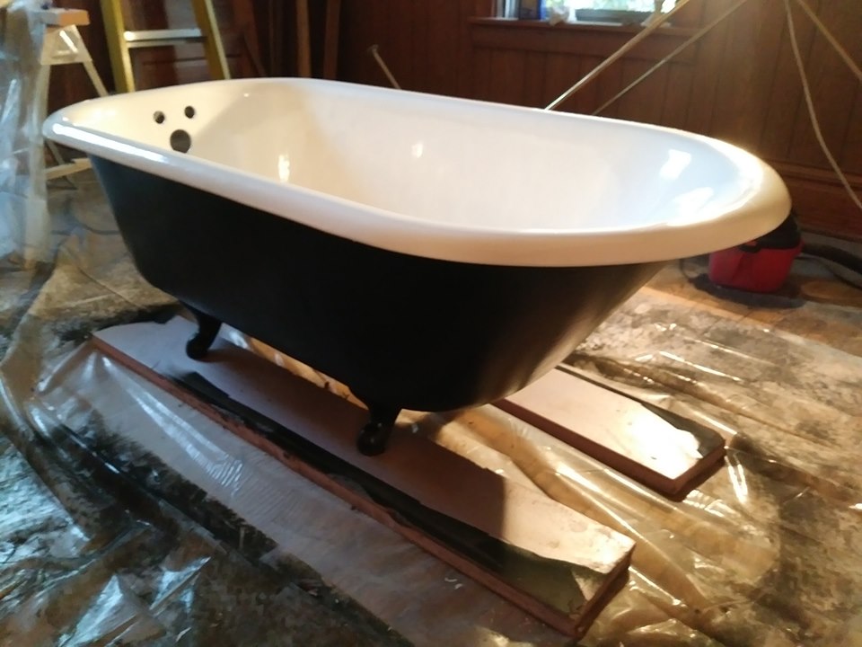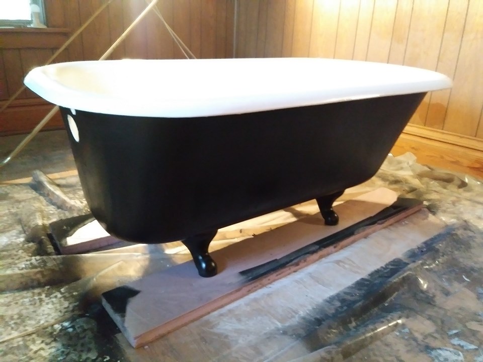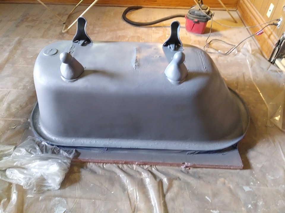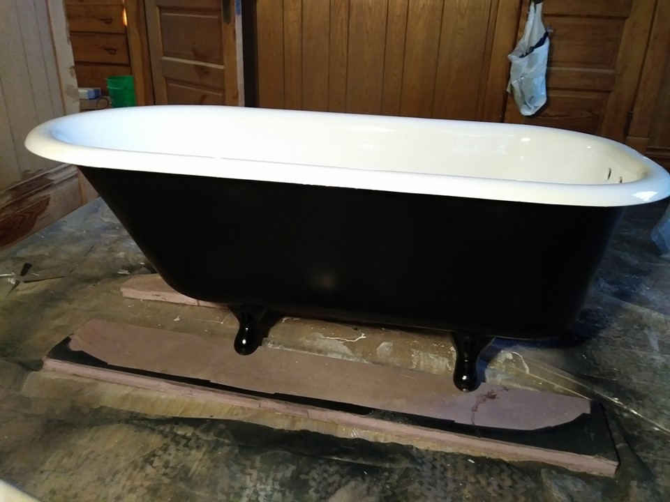 Ok Now for the finish, I flipped it over making sure nothing on the floor would mare my new epoxy finish. Some people pour epoxy on the exterior as well but I didnt want that. I sanded AGAIN with 80 grit on the exterior. Wiped it clean. I taped off any area that I thought might get paint on it including the faucet and drain holes again. I choose to use Rustoleum paint and Primer. You can get this in a liquid form on roll on or use a paint brush but since my tub isnt yet connected to plumbing, I was able to use the spray without worrying about it getting all over the decorator bath towels ; ) and here you have it..2 coats or Primer and 3 coats of Black Semi Gloss