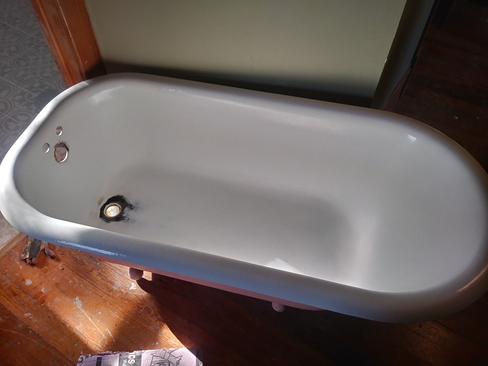 Sooo movinggggg along.. As you can see I couldn’t leave it like this. I just couldn’t so I set out yet again to get the best damn Pour on epoxy resin I could find! I didn’t want that spray on paint stuff that you can get at a home store for a quick fix, I wanted this to last forever or 20 years according to the epoxy I choose. I got the stuff used by Professionals and saved probably around $1K or more by not having to hire someone. I choose Ekopel 2K available HERE Again I lightly sanded the entire interior of the tub this time. I rinsed it out, wiped it dry and wiped it again with Acetone. I also taped the faucet and drain holes so I didn’t get the epoxy everywhere. This stuff is messy as hell so cover anything around you too. Just as above, MAKE sure if your tub is still attached to plumbing to cover the drain hole and faucet with tape also and make sure there are no drips coming out of the faucet. You don’t want water near the epoxy! also no dust whatsoever! (I know I sound like a dictator but I promise its important) Pour the hardener into the epoxy and stir for ten minutes. Set a timer. Really! Its needs to be smooth and you need to really make sure its incorporated or it wont set properly after you pour it. You don’t want tacky epoxy that will never dry. You have to use a sturdy paint stirrer to mix. It cant be any type of hand mixer or you’ll create bubbles of air in your epoxy. You’re terrified now right!? I wasn’t yet until this point. After you stir for ten minutes, you set another timer for an hour and 45 minutes. This is all the time you have to make the interior perfect. (Now I started to pray to Jesus!) I poured on the epoxy and spread it with my plastic spreader. I’ve attached a GREAT tutorial here of what I watched a million times to prepare. I did not use a roller and I used a hair dryer to pop the bubbles. Feel free to ask me any questions! Ps wear proper shoes unlike me. Remember I said that you don’t want this on your skin!? Just scrub the skin off your bones with Acetone If this happens LOL! Really its not that bad but it will ruin your Pedi…