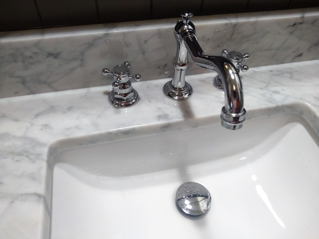 We decided on Carrara Marble we found at Menards and this vintage inspired faucet (found on Amazon) to match the shower surround.