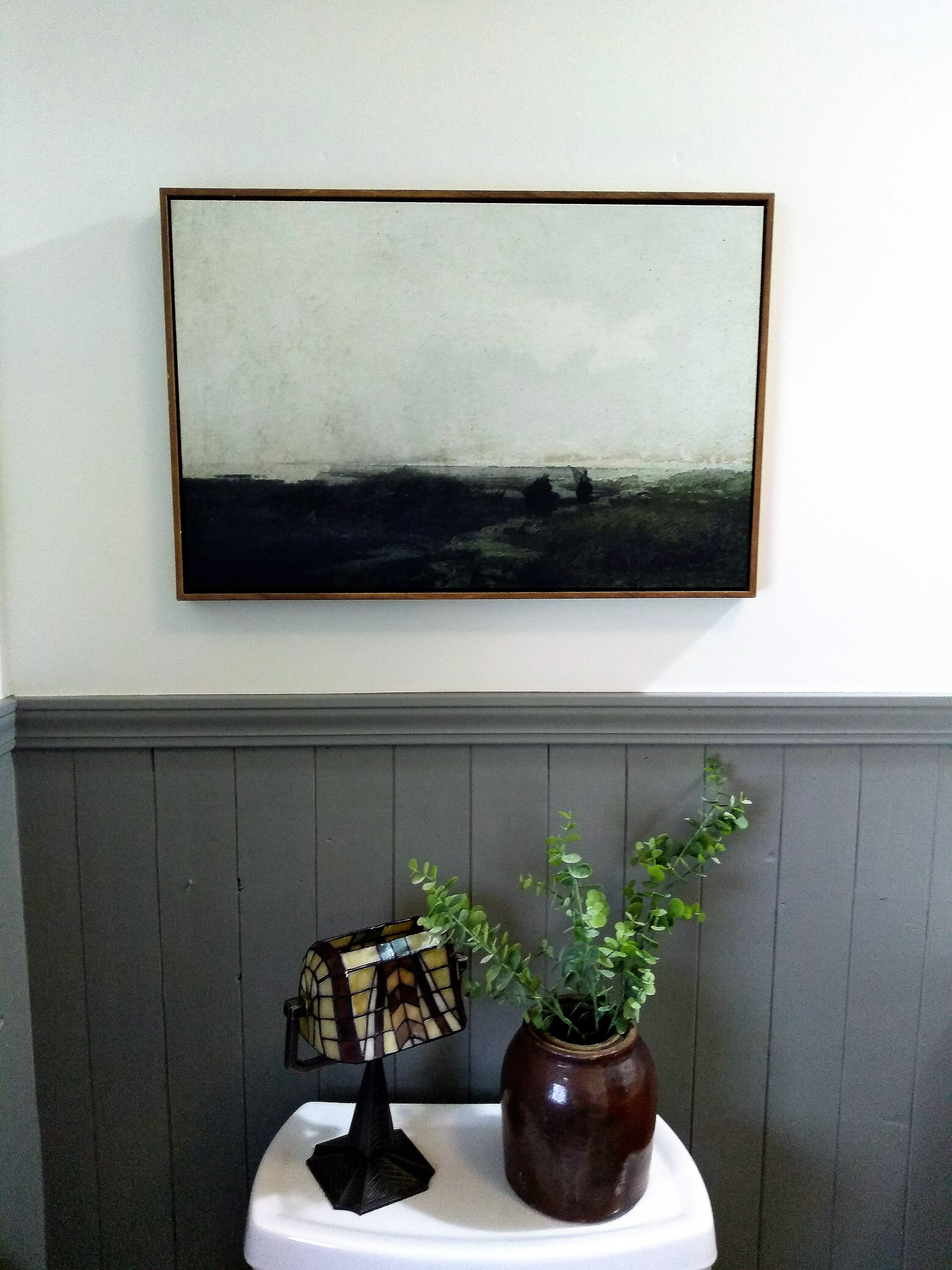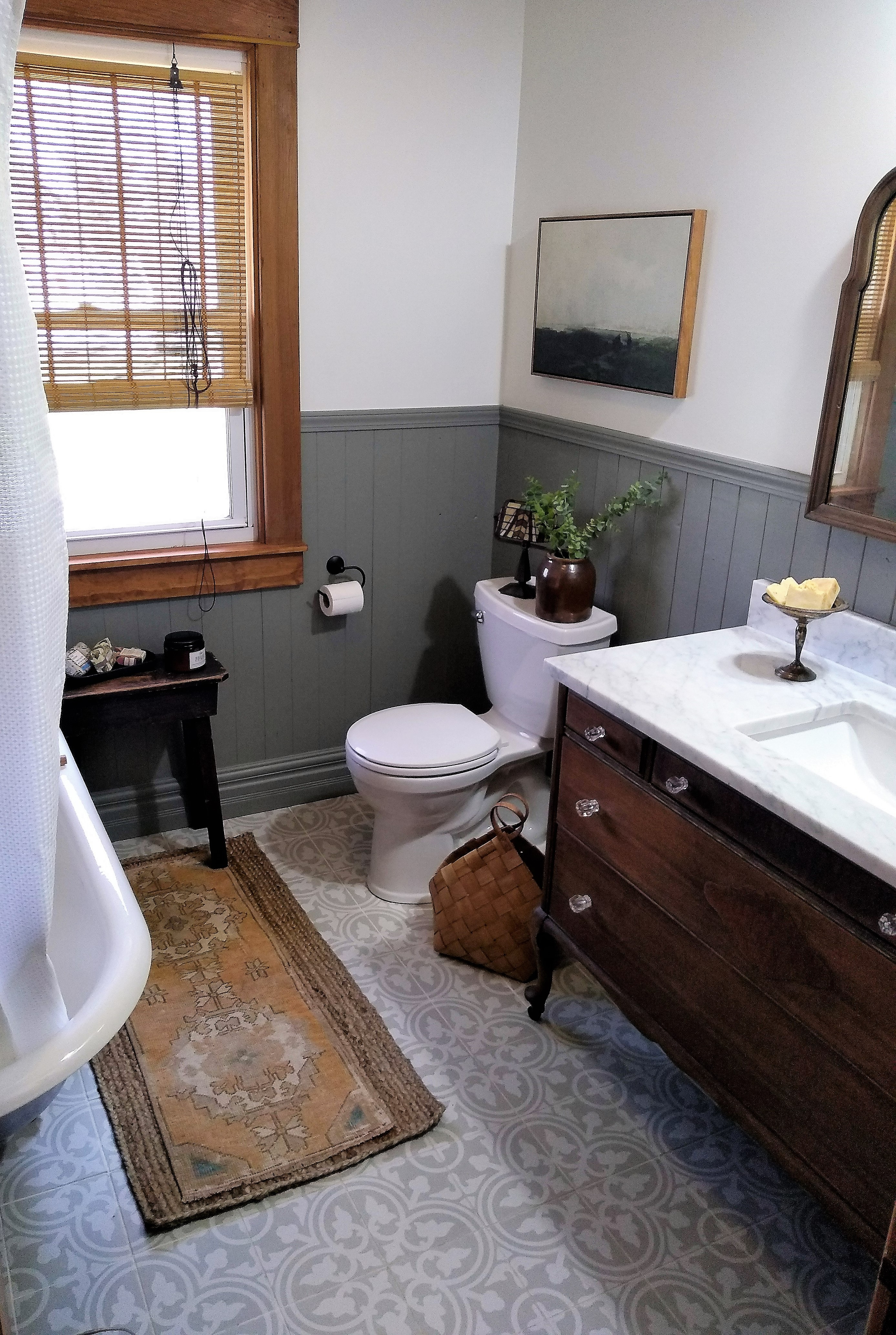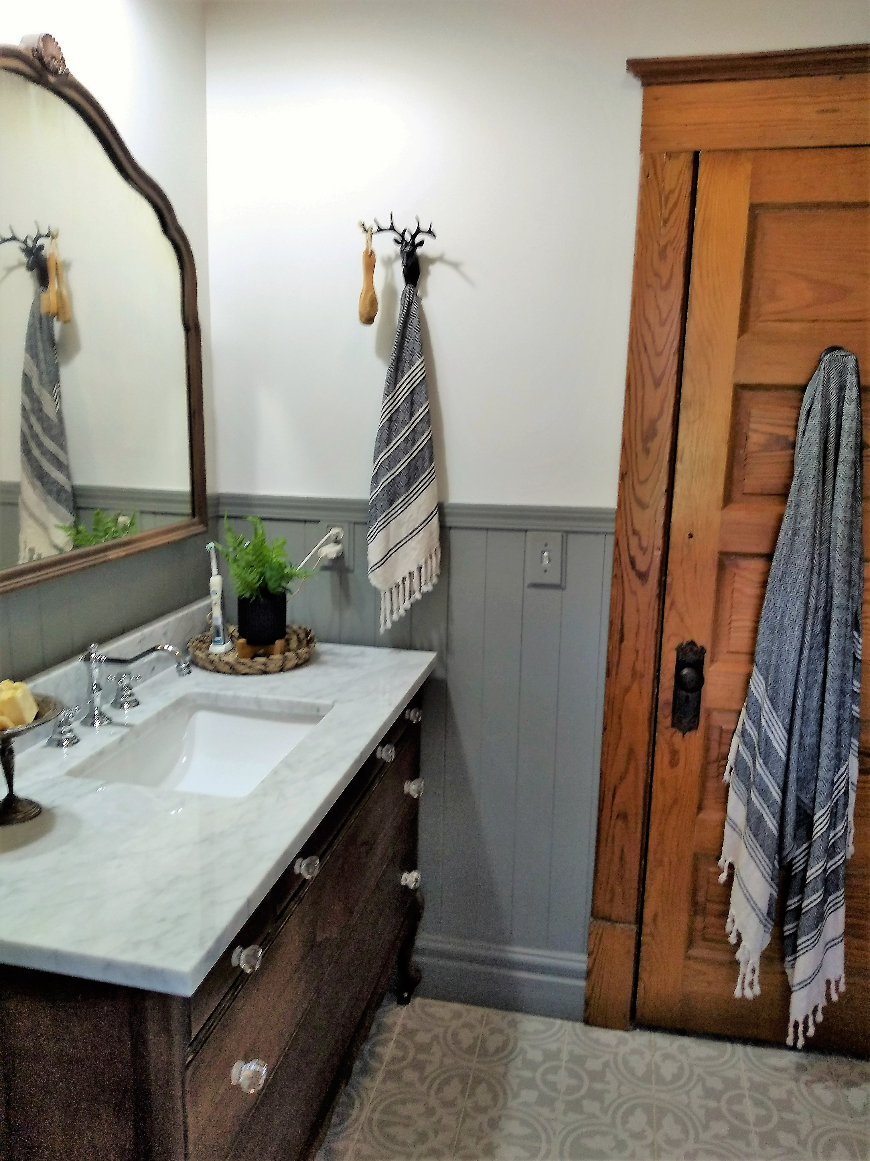 If you’ve seen my previous post Updating the Master bath and Declawing the Claw foot tub you’d know this is not at all how the Master turned out! We lived with it like this for 2 years (without a sink!). Something just wasn’t sitting right with me. The Master felt so sterile and eventually that shiplap wall we installed started to bubble along the edges due to hot showers and not having a ceiling exhaust fan installed. After years of thinking on it, I realized that although this house is actually on a Farm, It wasn’t really a Farmhouse and my Foursquare (with stained glass windows and chandelier’s dripping with crystals) was screaming at me for some more Fancy! So, I tried to accommodate her. First we ripped down that shiplap wall and installed new Drywall and continued the bottom shiplap around the room. I then painted the upper walls with Sherwin Williams Alabaster. Its a beautiful creamy white with slight yellow beige undertones that compliment the woodwork nicely. Then I used Sherwin Williams Storm Cloud Gray for the bottom half. Since we already had light gray tile from the first remodel, we weren’t about the remove it. I chose Storm cloud gray because although gray, it really has hazy green tones that lend a moody quality to the dark gray and still matches with the tile.